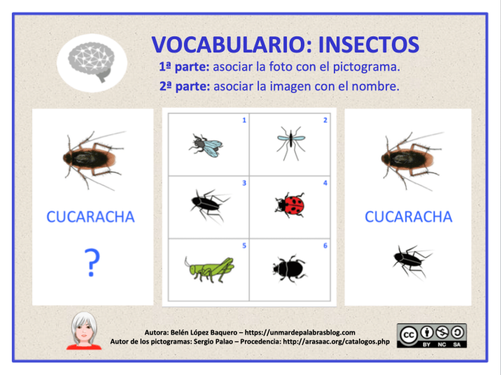 El objetivo de esta actividad es ampliar vocabulario de la categoría semántica INSECTOS. Consta de dos ejercicios y en cada uno de ellos se trabajan seis insectos.